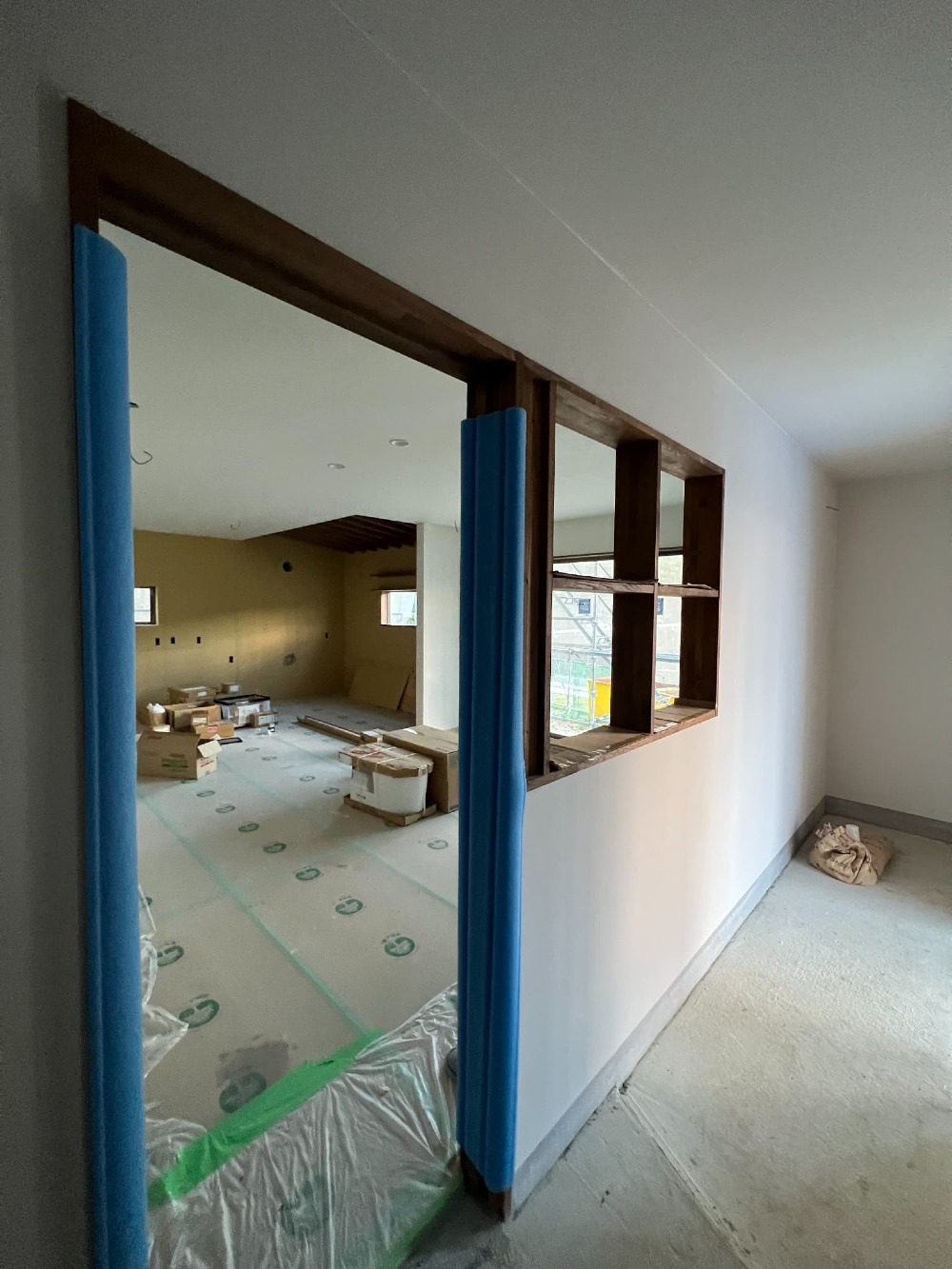 リビング入口の扉と一体になった造作窓もかたちになり始めています。色やサイズ感などもOさまと一緒にこだわって計画していますので完成が非常に楽しみです♪